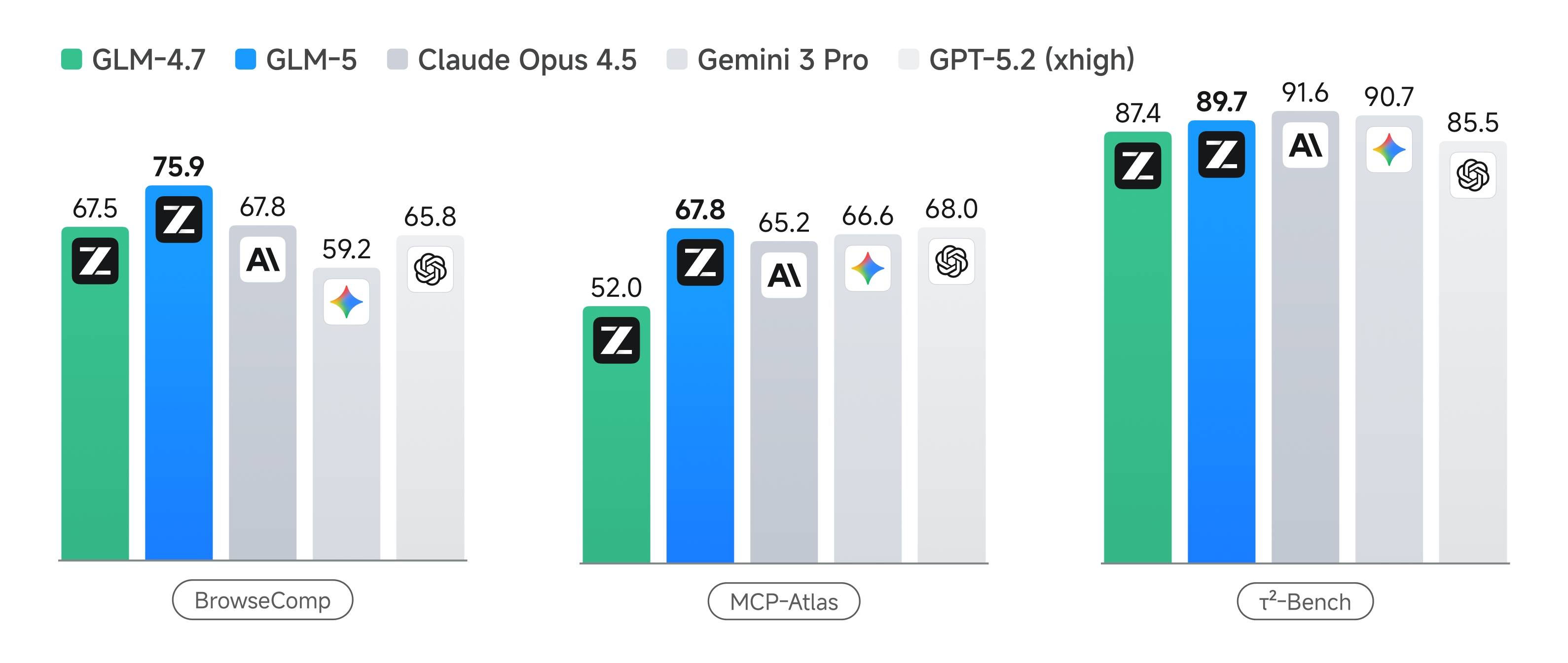 GLM-5 achieves state-of-the-art performance among open-weight models in agentic capability, ranking first across multiple authoritative benchmarks. On BrowseComp (web-scale retrieval and information synthesis), MCP-Atlas (tool invocation and multi-step task execution), and τ²-Bench (complex multi-tool planning and orchestration), GLM-5 delivers top open-model results across the board.